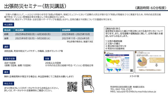 東京都は、大災害への備えとして、一人一人が自らを守る「自助」の取組や、地域コミュニティにおいて近隣の人同士が助け合う「共助」の取組をさらに推進するため、町会・自治会・マンション管理組合等に防災の専門家を派遣する「東京防災学習セミナー」を開催してします。