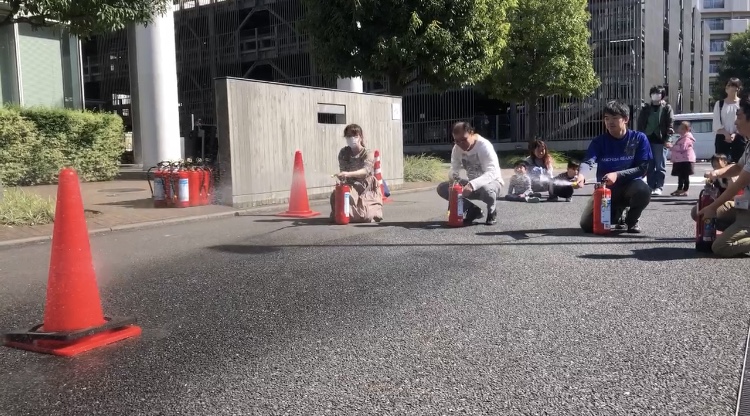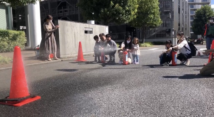 当日は、お子さんと一緒に水消火器を体験する等、防災について楽しく学びました。
